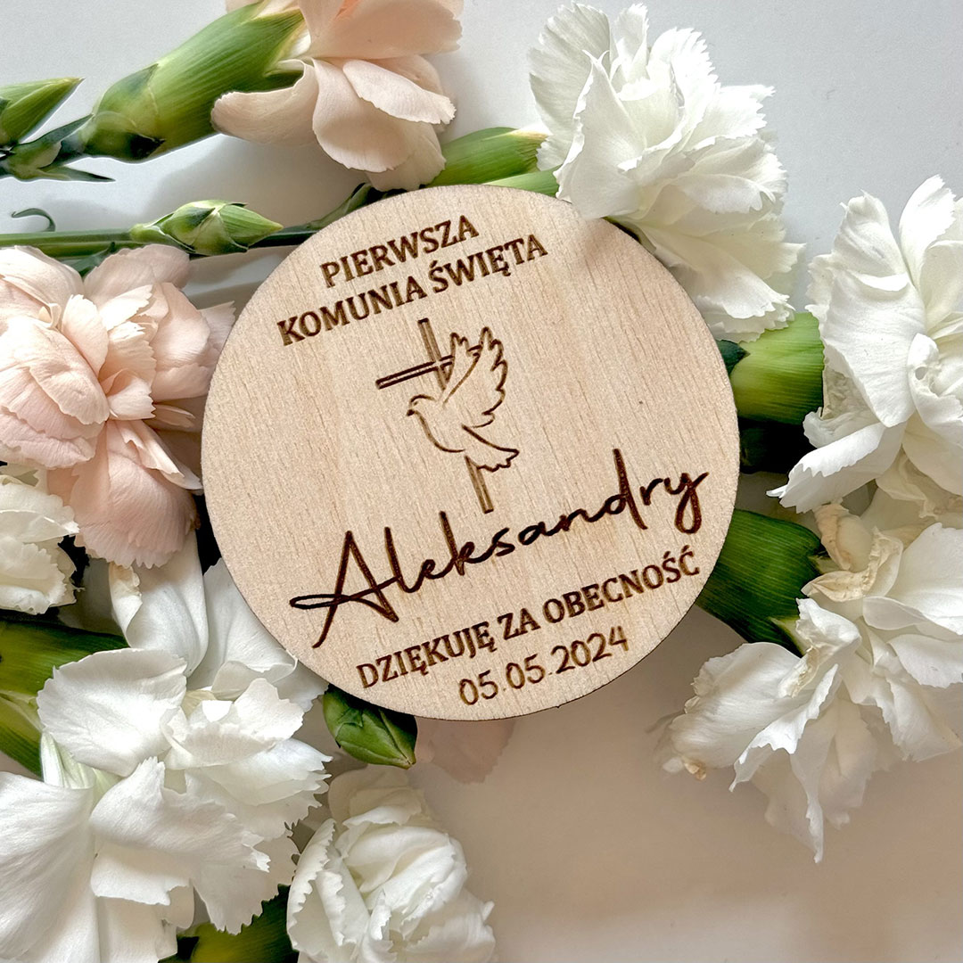 Idealny sposób, by podziękować gościom za obecność podczas Pierwszej Komunii Świętej. Magnes o średnicy 7,5 cm będzie piękną pamiątką na długie lata.