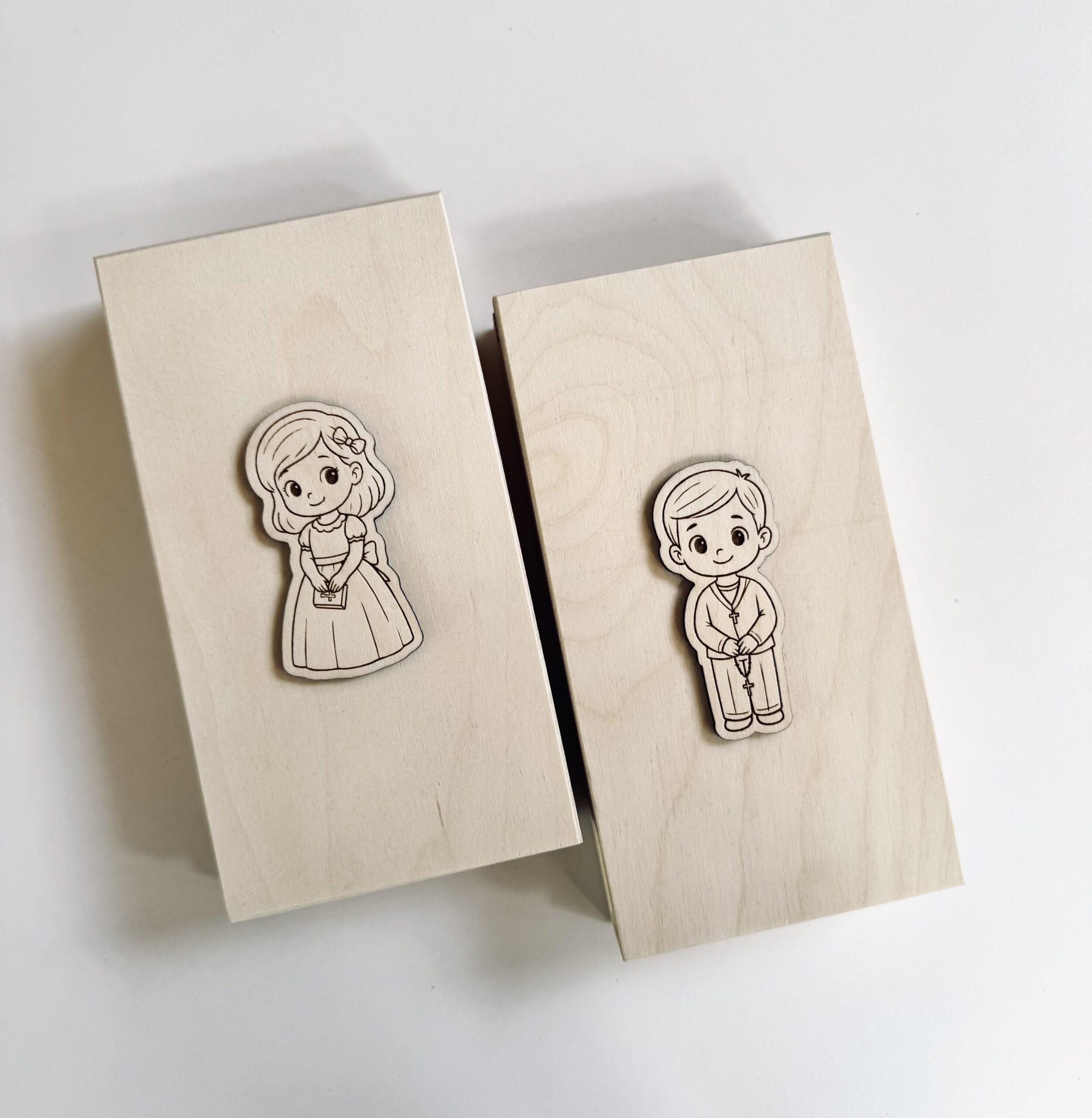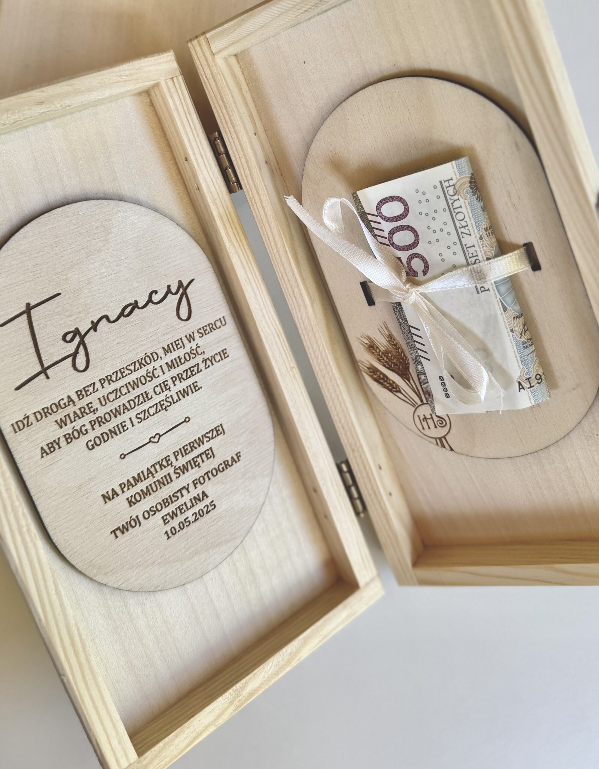 Eleganckie drewniane pudełko z miejscem na pieniądze, idealne na prezent z okazji Pierwszej Komunii Świętej.